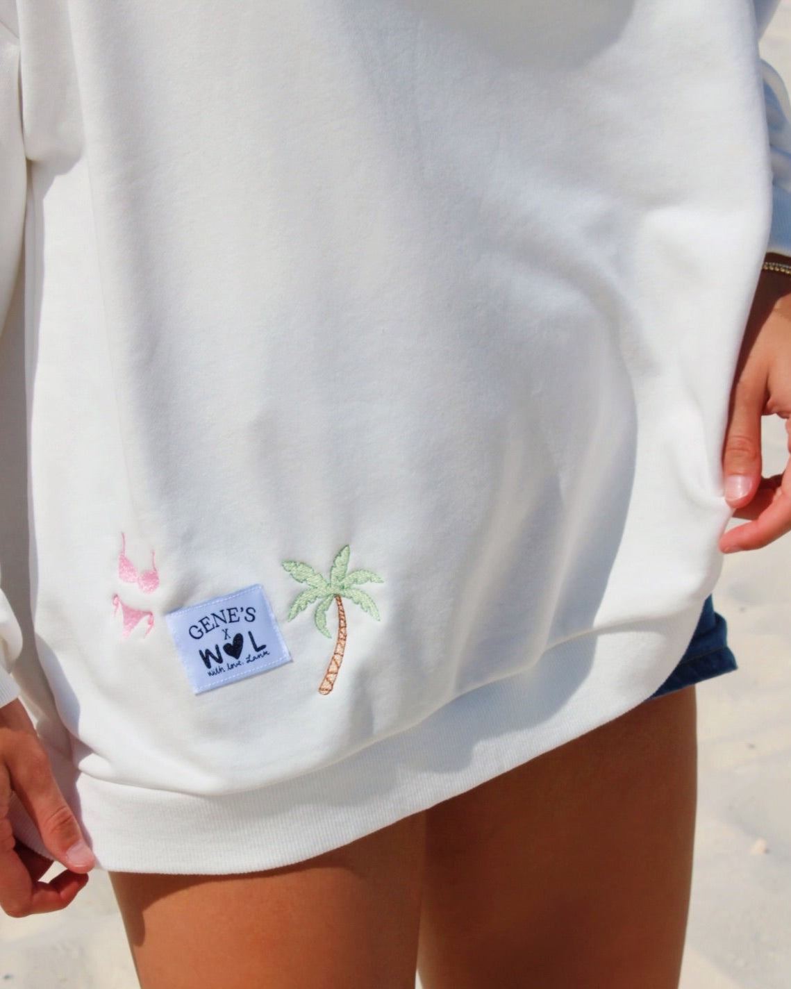 SIZING: oversized, buyer may want to size down. White terry cloth crewneck with pink bikini and green palm tree embroidery with limited GENE’S x WITH LIVE LANK tag between the two embroideries. Design is on the right-side corner.